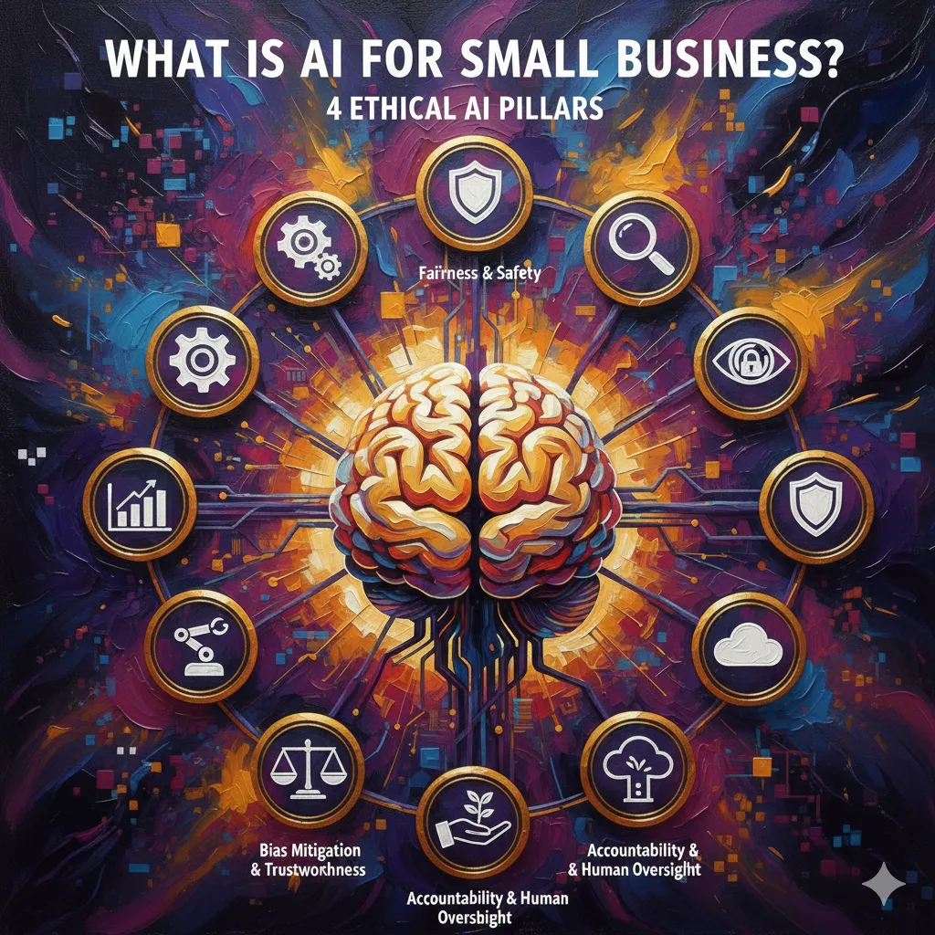 AI isn't just for tech giants. Discover how small businesses can leverage AI responsibly through 4 ethical pillars: eliminating bias, ensuring transparency, human oversight, and data privacy."